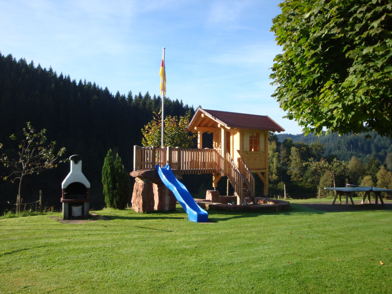 Große traumhafte Liegewiese mit Swimmingpool, Gartenmöbel, Spielhaus mit Rutsche, Lagerfeuerplatz, Grillstelle, Tischtennis, Trampolin, große Weißtannensonnenliege.
