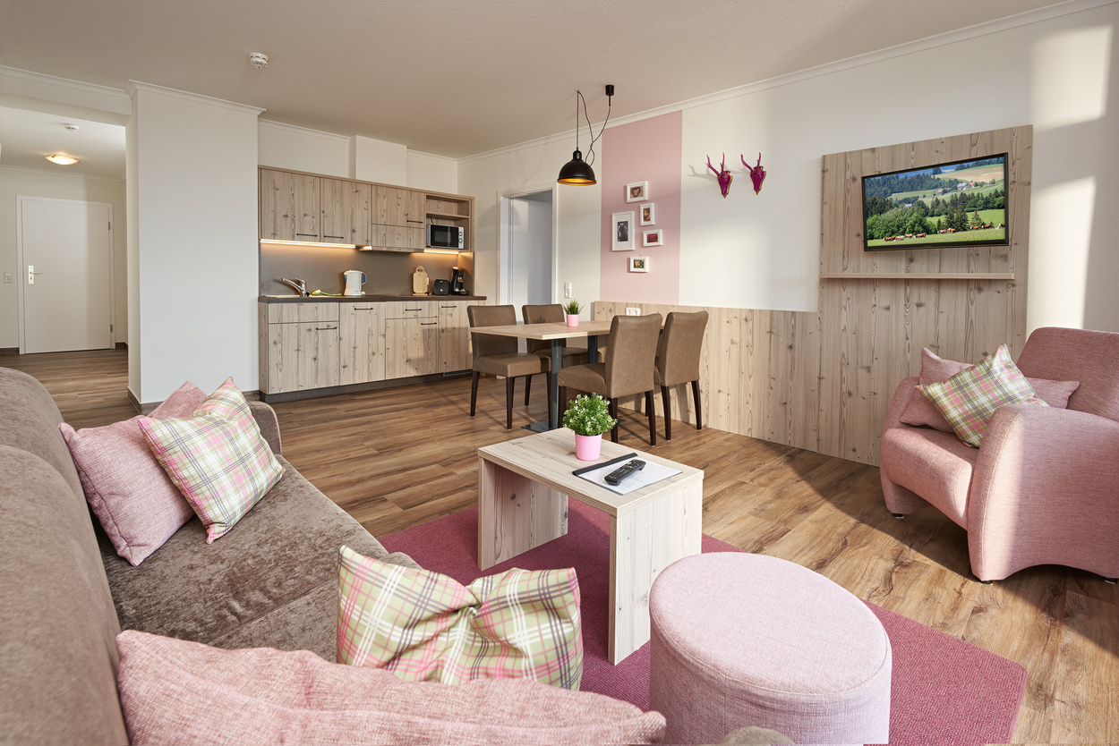 Hier stehen ab sofort mehrere Appartements in verschiedenen Größen für 2-6 Personen und 1-3 Schlafzimmern zur Verfügung. Zur Ausstattung gehören Wohn- Esszimmer mit Küche (mit Mikrowelle, Geschirrspüler, Kühlschrank, Herdplatten, Kaffeemaschine), Esstisch, Sofa und Sessel mit großem Flachbildschirm, W-Lan, Safe, überwiegend mit einem zusätzlichen separaten WC, großem Badezimmer mit bodenebener Dusche, WC, Schminkspiegel und Fön.