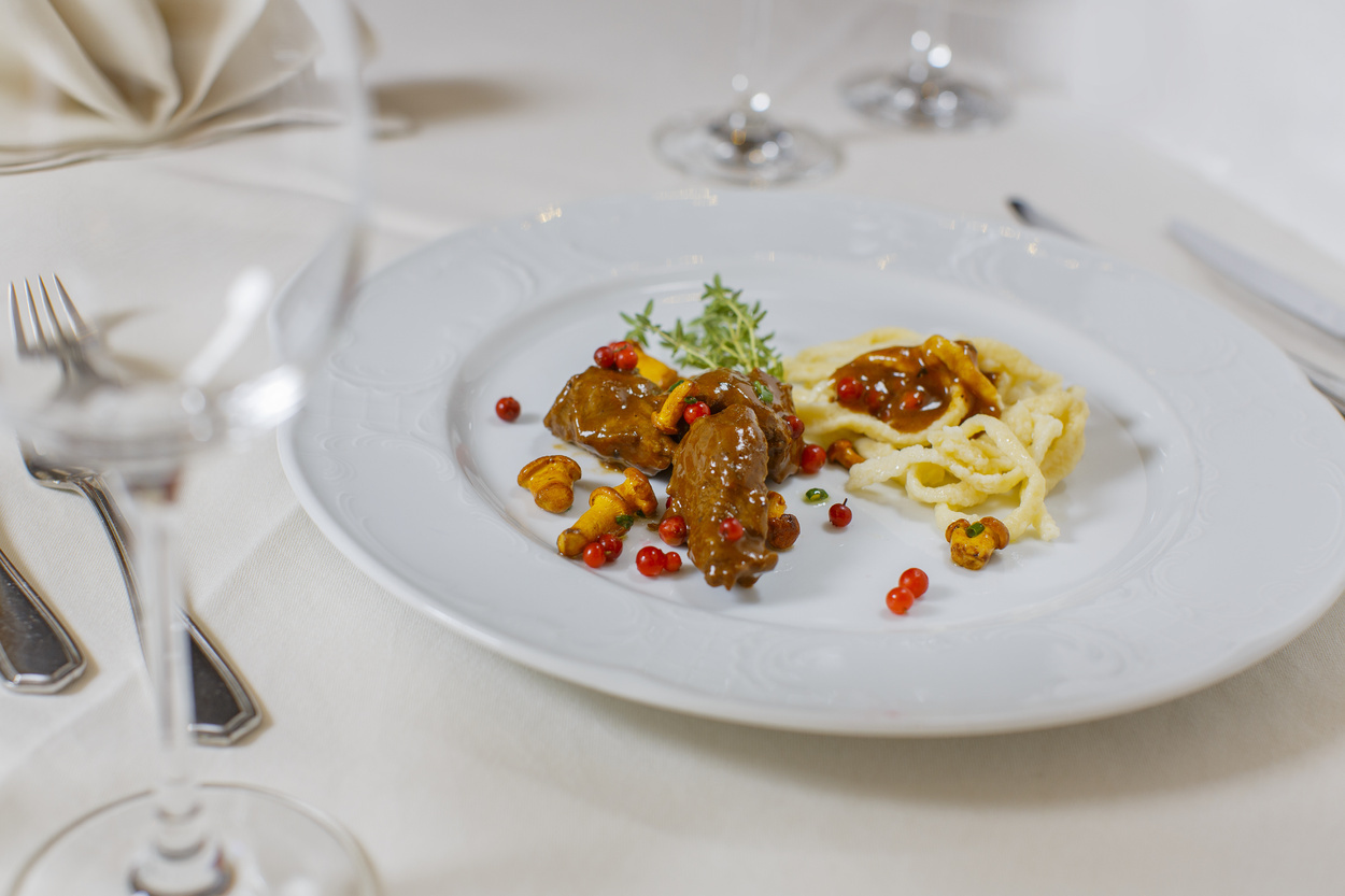 Zum Hirschen gehören gleich vier sehr gepflegte Häuser, alle mit vielen Blumen geschmückt und durch herrliche Grünanlagen verbunden. Auch das Fitneß-Angebot mit Tennis, Sauna und Solarium ist bemerkenswert. Da versteht man sofort, warum gleich mehrfach der Sonderpreis Schönes Gasthaus vergeben wurde. Schon diese behagliche Gastlichkeit, die man überall spüren kann, ist einen längeren Besuch wert. Auch die Auswahl erlesener regionaler Weine entspricht dem hohen Niveau.